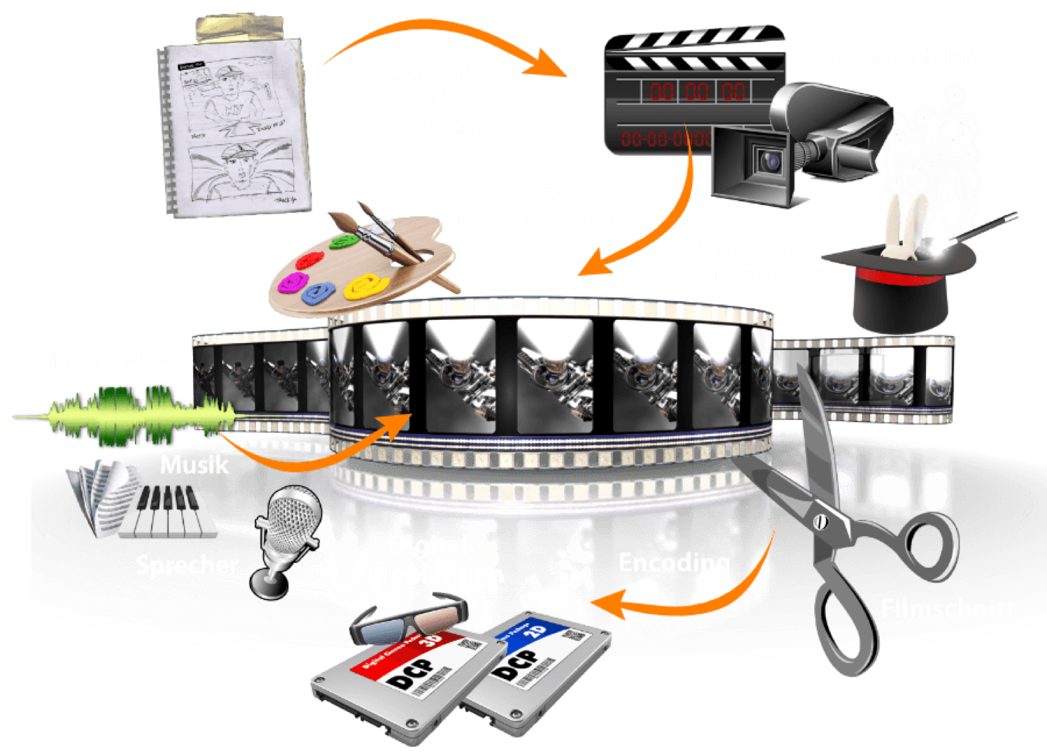 Starker Sound, hohe Bildqualität und die beeindruckende Größe der Leinwand machen Ihre Kampagne zu einem einprägsamen Erlebnis. Auf dem Weg von der Idee ins Kino setzten wir folgende Produktionsschritte für Sie um.